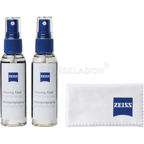 Profesionálna čistiaca sada Zeiss Cleaning Fluid, pre objektívy, fotoaparáty, ďalekohľady, mikroskopy, šošovky a iné optické príslušenstvo. Sada obsahuje špeciálny optický čistiaci roztok a mikrovláknovú utierku. Mokré čistenie predstavuje najefektívnejší spôsob odstraňovania nečistôt z fototechniky.